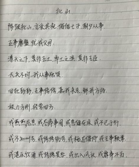 《北山》这首诗,今天抄了两次。之前抄过一次,一共是三次。 今天抄两次是因为对第一次抄的非常之不满意,用的是之前那种粗糙的纸和0.7的笔。 但是今天出水特别的差,大部分字都要二次加工 […]